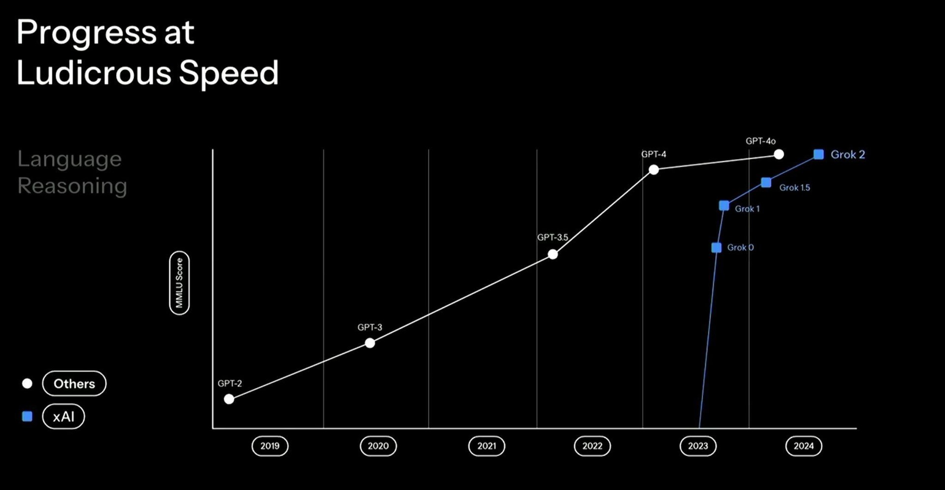 Доорх график нь xAI-ийн Grok загваруудын хөгжлийг OpenAI-ийн GPT загваруудтай харьцуулсан байна. MMLU оноогоор Grok загварууд 2023 оноос эхлэн хурдацтай хөгжиж, Grok 2 нь 2024 онд GPT-4 түвшинд хүрсэн байна. Цагаан цэгүүд нь OpenAI-ийн GPT загваруудыг, хөх дөрвөлжинүүд нь xAI-ийн Grok загваруудыг илэрхийлж байна. Grok 0-оос эхэлсэн хөгжил богино хугацаанд Grok 2 хүртэл огцом өссөн нь харагдаж байна. Энэ нь xAI-ийн хиймэл оюуны хөгжлийн хурд маш өндөр байгааг илтгэнэ.